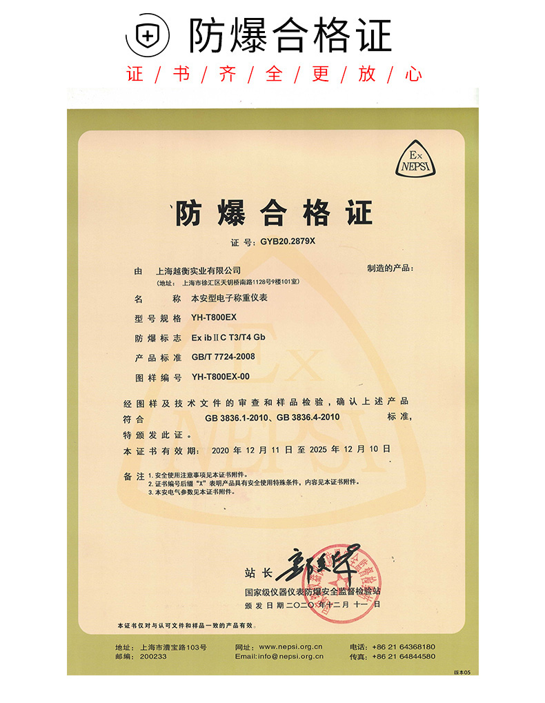 上海越衡生產(chǎn)的防爆系列的稱重設備、電子秤都是具備專業(yè)機構認證的防爆合格證書,這些證書不僅是對其產(chǎn)品質量的權威認可,更是對客戶安全的鄭重承諾。在設計和生產(chǎn)過程中,上海越衡嚴格遵守國家及國際的防爆標準和規(guī)范,確保每一臺設備都能在高風險環(huán)境中穩(wěn)定運行,有效防止因設備故障而引發(fā)的爆炸事故。此外,上海越衡還不斷投入研發(fā),提升產(chǎn)品的防爆性能和智能化水平,以滿足不同客戶的需求。其防爆稱重設備和電子秤已廣泛應用于石油、化工、制藥等危險環(huán)境,為企業(yè)的安全生產(chǎn)提供了堅實保障。選擇上海越衡,就是選擇了可靠的安全伙伴。